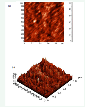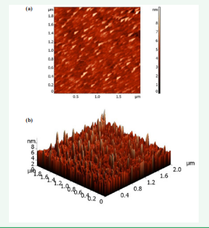 shows 2 and 3 D AFM pictures of the ~3 nm thick film. No clear base structure is seen in two dimensional AFM pictures of the films. However 3D picture shows an increase in the height of the nanoparticles. Figure (7)