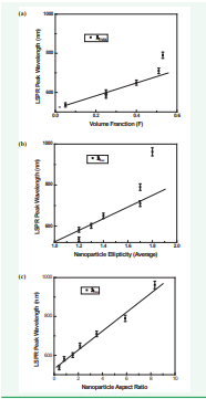 Figure 8 Variation in the localized surface plasmon resonance peak wavelength with, (a) Volume fraction of the nanoparticles in the films, (b) Average ellipticity of the nanoparticles in the films, (c) Aspect ratio of the nanoparticles in the films.