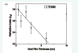 The nanostructured gold thin films show LSPR in its absorption spectra at the wavelengths ranging from visible to (a) (b) 0 5 10 2.3 2.4 2.5 2.6 R. Index Refractive Index (ns) Gold Film Thickness (nm) 0 2 4 6 2.3 2.4 2.5 2.6 R. Index Refractive Index (ns) Gold Nanoparticle Aspect Ratio Figure 9 Variation in the refractive index of the thin films with, (a) Film thickness, (b) Aspect ratio of the nanoparticles in the thin films. 500 600 700 800 2.3 2.4 2.5 2.6 R Index Refractive Index (A. U.) LSPR Peak Wavelength (nm) Figure 10 Variation in the refractive index of the thin films with LSPR peak wavelength. near infrared wavelength depending on the thickness of films. Each parameter of the film such as the volume fraction, the sizes and the shapes of the NPs as well as the surface roughness have an important role in deciding the optical properties of the thin films. A good correlation has been found between the optical properties of the thin films such as LSPR and the refractive index of the surrounding medium with the surface morphology of films. The above results further indicate that the Mie [4-5] and the Maxwell Garnet theory [31] explains the observations mainly for the gold thin films having NPs of nearly spherical shape having ellipticity close to one. Such thin films can be useful as a substrate either for the study of surface enhanced spectroscopy or as a good refractive index sensor for organic or biological samples. However, further investigation is required in this direction to obtain a plasmonic film with better surface morphology and optical properties in order to have a sensor with better sensitivity for various applications.