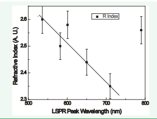 Figure 10 Variation in the refractive index of the thin films with LSPR peak wavelength.