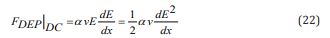 where α is the induced polarisability, or effective dipole moment, per unit volume, v, in unit electric field and has units Farad per metre (Fm-1). It is assumed, for the force to be proportional to the derivative of E in (20), that the length of the dipole p is small compared with the characteristic length of the electric field non-uniformity. Any spatial electric field phase variation is considered to be negligible so that consideration is confined solely to the in-phase component of the DEP force, and that the polarisability is real, α ∈ R . Combining (20) and (21),