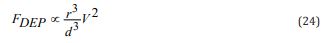 The third feature of (23) lies in terms of scaling relations used in nanotechnology. A simple and effective way of considering the DEP force is to recall that E is determined by Poisson’s or Laplace’s equation. This implies (23) shows where d represents the characteristic length of the structure or feature size generating the nonuniform electric field. This means that if r and d decrease by the same amount, i.e. from µm to nm in body and feature size, the DEP force remains the same (subject to the previous caveats). This principle of invariance to scale enables DEP, in principle, to be an attractive means of moving biomolecules on the nanoscale even if earlier work was on the micro-scale or larger. It also remains proportional to the square of the voltage, V, across the electrodes.