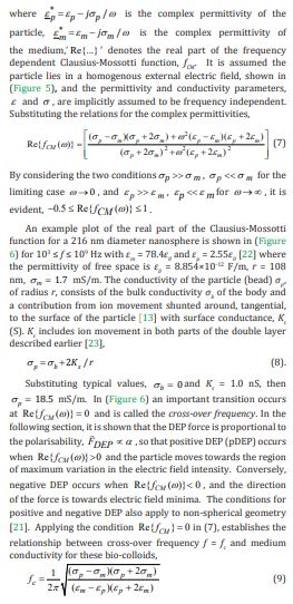 Substituting typical values, 0 σ b = and Ks = 1.0 nS, then 18.5 σ p = mS/m. In (Figure 6) an important transition occurs at Re{ ( )} 0 fCM ω = and is called the cross-over frequency. In the following section, it is shown that the DEP force is proportional to the polarisability, ∝ α r FDEP , so that positive DEP (pDEP) occurs when Re{ ( )} 0 fCM ω > and the particle moves towards the region of maximum variation in the electric field intensity. Conversely, negative DEP occurs when Re{ ( )} 0 fCM ω < , and the direction of the force is towards electric field minima. The conditions for positive and negative DEP also apply to non-spherical geometry [21]. Applying the condition Re{ } 0 fCM = in (7), establishes the relationship between cross-over frequency f = f c and medium conductivity for these bio-colloids,