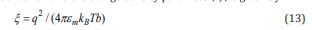 where q is the elementary charge, 0 ε ε ε m rm = is the permittivity of the bulk electrolyte medium, εr is the relative permittivity, kBT is the Boltzmann temperature, and b is the average distance between charged sites; for B-DNA double helix, b = 1.73 Å. The ‘Manning-Mandel-Oosawa’ model yields a generalised expression for scalar longitudinal polarisability αs per subunit length Ls ,