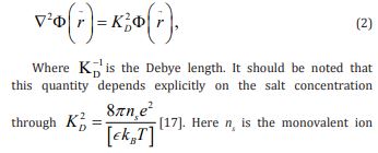 Where KB the Boltzmann is constant, T is the absolute temperature, and Φ is the value of the dimensionless electrostatic potential at the surface. The effect of the salt ions on the membrane is obtained by calculating the electrostatic potential and substituting it into equation (1). When the potential is small, Φ(r) 1, ? ? (high salt concentrations) the Poisson-Boltzmann (PB) can be linearized and directly solved, which in Gaussian units, for diluted solutions and small electrostatic potential is given as follows [16]: