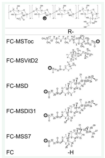 Figure 1 Structure of DL-α-tocopherol hemisuccinyl fructose chitosan (FC-MSToc), ergocalciferol hemisuccinyl fructose chitosan (FC-MSVitD2), diosgenin hemisuccinyl fructose chitosan (FC-MSD), DI-31 hemisuccinyl fructose chitosan (FC-MSDI31), S7 hemisuccinyl fructose chitosan (FC-MSS7) conjugates and fructose chitosan (FC).