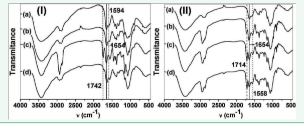The IR spectrum of the FC-MSD conjugate (Figure 3 (II) (b)) presents an intense absorption band at 1734 cm-1 (C=O of ester linkage) and an intense band at 1557 cm-1 (Amide II band, N-H bending of amide linkage formed between diosgenin hemisuccinate and FC). The brassinosteroid-N-modified fructose chitosan IR spectra (Figure 3 (II) (c) and (d)) showed intense  ketone C=O absorptions at 1714 cm-1, which overlaps the C=O absorptions at 1730-1740 cm-1 of ester linkage (not observables), and intense absorption bands at 1558 cm-1 (Amide II band, N-H bending of amide linkage formed between steroid hemisuccinates and FC).