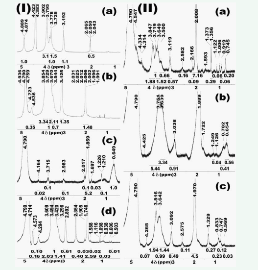 Figure 4 Proton NMR spectra of (I): (a) chitosan and (b) FC at 8 mg mL-1 in D2O; (c) FC-MSToc and (d) FC-MSVitD2 at 25 mg mL-1 in CD3COOD/ D2O (1:3) at 25 °C; (II): (a) FC-MSD, (b) FC-MSDI31 and (c) FC-MSS7 at 25 mg mL-1 in CD3COOD/D2O (1:3) at 25 °C (see Figure 1 for structures).