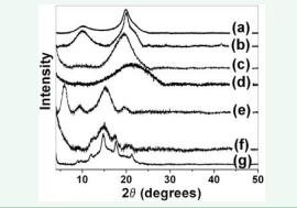 Figure 5 Wide-angle X-ray diffraction patterns of: (a) chitosan, (b) FC,  (c) FC-MSToc, (d) FC-MSVitD2, (e) FC-MSD, (f) FC-MSDI31 and (g) FCMSS7 (see Figure 1 for structures)