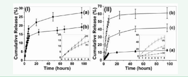 The spectra of chitosan and fructose chitosan are also included for comparison. The IR spectrum of chitosan (Figure 3 (I) (a)) presented the characteristic absorption peaks at 2942-2784 cm?1 (aliphatic C-H stretching band), 1658 cm-1 (Amide 1) and 1597 cm-1 (-NH2 ) bending and 1321 cm-1 (Amide III). Absorption peaks at 1154 cm-1 (antisymmetric stretching of the C-O-C bridge), 1082 and 1032 cm-1 (skeletal vibrations involving the C-O stretching) are due to its saccharide structure [28]. Fructose chitosan showed a quite similar IR spectrum (Figure 3(I) (b)), due to lack of additional functional groups compared to chitosan and low substitution degree with fructose (5.6 mol- %). On the other hand, the synthesized FC-vitamin and FC-steroid conjugates showed additional characteristic peaks. Thus, FCMSToc conjugate (Figure 3 (I) (c)) exhibited C=O IR absorption at 1742 cm-1 (ester linkage) and an intense peak at 1557 cm-1 (Amide II band, N-H bending of amide groups formed between tocopheryl hemisuccinate and FC). Besides, the FTIR spectrum of FC-MSVitD2 (Figure 3 (I) (d)) showed the C=O absorption band at 1734 cm-1 (ester linkage) as a slight shoulder due to a low functionalization of chitosan matrix with ergocalciferol (5.5 mol-%), while an intense absorption band at 1560 cm-1 (Amide II band, N-H bending of amide formed between ergocalciferol hemisuccinate and FC) is also observed.