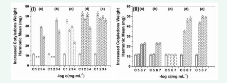 The radish (Raphanus sativus) test was employed in order to assess plant growth activity. This bioassay consists of measuring the increased weight of the treated radish’s cotyledons (auxin type activity). Briefly, radish seeds previously sanitized by sodium hypochlorite treatment were germinated on wet filter paper in dark at 25 ° C, for 72 h [25]. Cotyledons were separated of hypocotyls and excess water was removed with filter paper. The cotyledons were weighted and treated with 5 mL of FC-MSDI31 or FC-MSS7 nanoparticles in water (10-1 to 10-7 mg mL-1); DI31 or S7 solutions (10-1 to 10-7 mg mL-1); fructose chitosan aqueous solution (10-1 to 10-7 mg mL-1) or bi-distilled water (control). After 72 h, cotyledons were weighted again. These studies were performed in triplicate for each sample and concentration (10 cotyledons per each run).