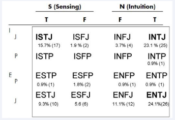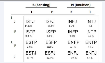 for an explanation of the dichotomies) to create a four letter type of which there are sixteen permutations (e.g., ENFJ, ISTP…etc). The distribution of these types in the general population is shown in Figure 1.