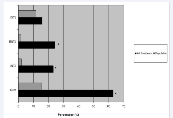 Figure 3 Frequency of the three most common types among neurosurgical residents compared to the general population. Two of the Thinking-Judging types (INTJ and ENJT) are disproportionately represented compared to the general population. Statistical significance (p<0.001) is denoted by (*).