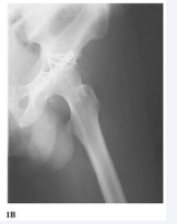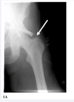 Figure 1: (A): Insufficient fixation of acetabular fracture with long and not properly contoured plate. Notice the lateral end of the plate being not attached to underlying bone (arrow).