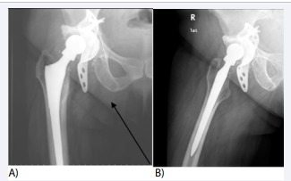 Figure 2: Anteroposterior (A) and lateral (B) x-ray of total hip replacement with protrusion cup vertically positioned. Notice that the lower part of the cage is not in contact to the underlying sciatic bone (pointed with black arrow), laying inside the muscles.