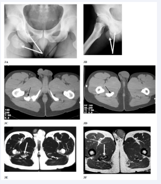 Figure 3: Anteroposterior (3A) pelvic and lateral (3B) right hip x-rays Two circumferential bony masses are pointed by white arrows. CT scan images (3C and 3D) where the ectopic bone is pointed by black arrows. MRI images (3E and 3F) where the pathology is pointed by white arrows.