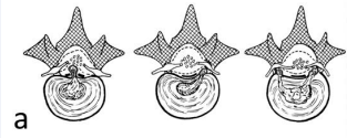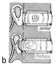 When the tears of the AF are extensive, and involves all the lamellae, the true protrusion or prolapsed of the NP occurs, mainly towards dorsal or the dorso-lateral sectors (Figure 1a). These retrograde prolapsed NP were observed so often, that Schmorl called them accessory nucleus pulposus, dystopy of the NP, or nodes of the NP, and he did not give clinical importance [1]. These prolapsed NP were interpreted as disease due to wear of the IVD tissues and thus as an integral part of the chondrosis. The subsequent stage to the chondrosis was characterized by height reduction of the intervertebral space, calcification and subsequent sclerosis of the cartilaginous end plates (CP); he denominated it as osteochondrosis.