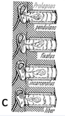 But when Schmorl analyzed the structure of the extruded tissue obtained from surgical pieces, observed that all the IVD components were present. He found only parts of the NP but also segments of the AF and of PC. He proposed the denomination of disc prolapsed instead of NP prolapsed, since all the elements of the IVD were present, although Schmorl himself affirms that was Geipel who introduced this term. Furthermore, during the study of long series of postmortem IVD Schmorl described and classified for the first time the different forms of IVD prolapsed: pendulans, fixatus, incarceratus and liber (sequestration) (Figure 1c) [4].