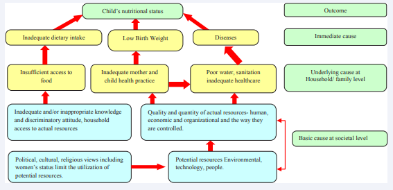 Aetiology of malnutrition is multifactorial. As shown in the Figure 1. The important immediate causes of marasmus are inadequate dietary intake (deprivation), disease, particularly infectious disease and low birth weight particularly IUGR. Under nutrition makes children vulnerable to disease particularly infectious diseases. On the other hand children are likely to develop under nutrition following suffering from diseases like pneumonia, diarrhoea, measles tuberculosis etc. There are two well known vicious cycles involving malnutrition→ infection →malnutrition and malnutrition→ diarrhoea→ malnutrition. LBW associated IUGR may not show catch up growth and do not get weight properly and may remain under nourished. Nutrition sensitive factors for malnutrition are access to preventive and curative health service to all community members as well as hygienic and sanitary environment, an access to safe drinking water (Figure 1).