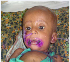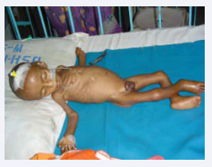 Marasmus is the most common form of severe malnutrition in nutritional emergencies. The word marasmus is derived from the Greek word marasmos, which means wasting. It is characterized by severe wasting of fat and muscle which the body breaks down to make energy. Affected children exhibit extreme wasting and have the appearance of old man appearance with just skin and bones visible. The body of wasted child tries to conserve energy by poor activity and reducing metabolic process. Initially they look alert and active and have good appetite but as the disease progresses they become irritable, less active and develop food refusal [2].