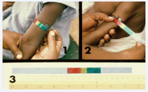 Figure 14: Assessment of malnutrition in community using MUAC. Well nourished child’s MUAC falls in green zone (1), where as malnourished child’s MUAC in red (<110mm) zone (2), Measurement scale (3)