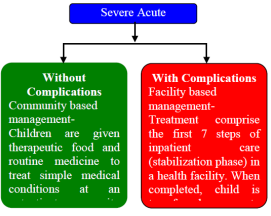 SAM is classified on the basis of whether there is co-existent life threatening complications. Children presenting with SAM complicated by life threatening illness receive inpatient care according to WHO treatment protocol. Those with SAM but without life threatening complications are treated through weekly or fortnightly therapeutic programme.