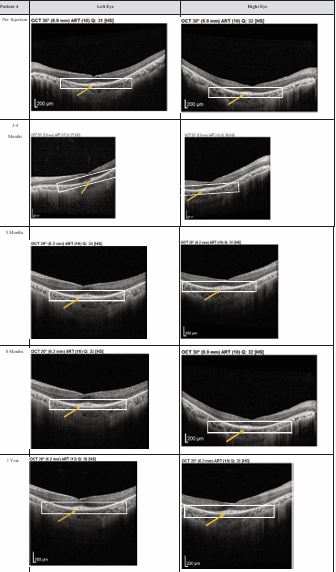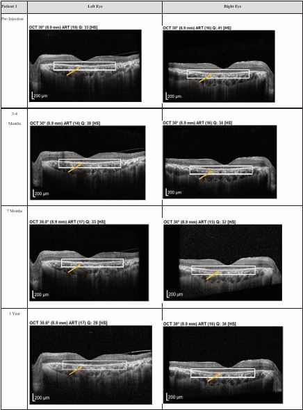 Figure 4 Optical coherence tomography (OCT) images for both eyes of Patient 4 from pre-injection up to 1 year follow-up. Orange arrow demonstrates the presence of hyperreflective material at the interdigitation area of the photoreceptors at the macula and extramacular region. These were observed and maintained until the last follow-up examination.