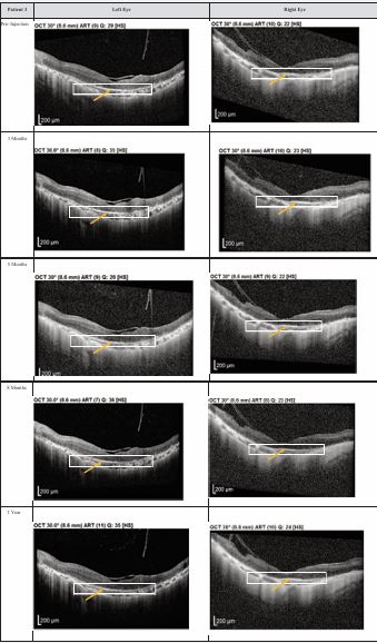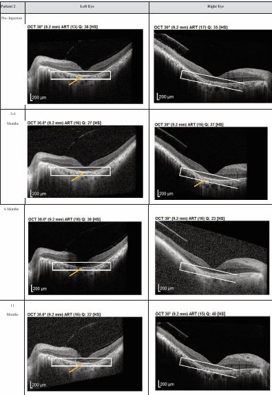 Figure 2 Optical coherence tomography (OCT) images for both eyes of Patient 2 from pre-injection up to 11 month follow- up. Orange arrow demonstrates the presence of hyperreflective material at the interdigitation area of the photoreceptors at the macula and extramacular region. These were observed and maintained until the last follow-up examination.