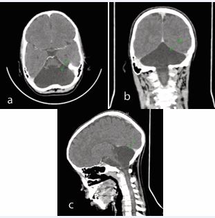 Figure 1 (a) Axial plane of contrast-enhanced CT scan of the brain complete absence of both cerebellar hemispheres replaced with cystic fluid component extending along the medullar oblongata (b) Coronal plane of contrast-enhanced CT scan of the brain (c) Sagittal plane of contrast enhance CT scan of the brain.