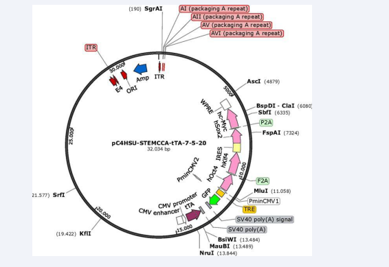 Figure 1: pC4HSU HD shuttle- It consists of the inverted terminal repeats (ITRs) for Ad 5 virus, the packaging signal and part of the E4 adenoviral region plus a stuffer non- coding DNA of human origin which keeps a suitable size (28-31 Kbp) of the viral DNA. The whole expression cassette (STEMCCA cassette 10,065 bp) was cloned into the pC4HSU HD shuttle at the AscI and SwaI. For further details [Figure 2 A] legend.