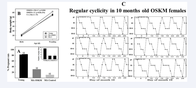 Figure 4 Plot A: Effect of long-term OSKM-GFP gene therapy on the pregnancy rate, litter size, pup BW and estrous cyclicity in MA female rats. There were three experimental groups; 4 months old intact females (Young, N=12), 9.3 months old control rats (MA control N=12) and 9.3 months old OSKM-treated rats (MA OSKM N=12). Plot B: Pups were weighed when they were 1 or 2 days old and again at weaning (21 days). Plot C: During the 10th month of life daily vaginal smears were taken in 6 nonpregnant OSKM-treated rats in order to assess the effect of the OSKM gene therapy on regularity of estrous cyclicity. The estrous cycle phases are indicated as follows, P, proestrus; E, estrus, D1, early diestrus ; D2, Late diestrus.