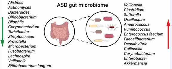 Gut microflora is an important component of the gut brain axis and is closely associated with human health. The human gut is inhabited by a large number and variety of microorganisms that form a complex interaction with the host, and their balance is essential for health. In recent years, studies have shown that ASD is closely related to gut dysbiosis, and that there are significant differences in the composition of the gut flora between children with ASD and healthy children.Among the diverse and changing gut bacteria in patients with ASD, changes in beneficial bacteria have been the focus of research.Wang et al. [31], found a decrease in Bifidobacterium bifidum and Bifidobacterium longum, and an increase in Clostridium perfringens and Ruminalococcus in patients with ASD using 16S rRNA technology, suggesting that a decrease in beneficial bacteria and an increase in potentially pathogenic bacteria may increase the risk of ASD. However, Dalia et al. [32], found elevated leves of lactobacilli in the intestines of patients with ASD, which may be associated with a decrease in short-chain fatty acids, a microbial metabolite associated with the intestinal tract. This result is in line with the study of Joby et al. [33], who demonstrated that the relative abundance of Lactobacillus in the gut of ASD patients was 32 times higher than that of healthy children, suggesting a strong association with the development of ASD. This discrepancy between the results of different studies may stem from the diversity of the study samples. These samples differed significantly in terms of geography, age, and dietary habits. Figure 1 illustrates the common bacterial taxa that have changed in the gut of ASD patients in several studies.