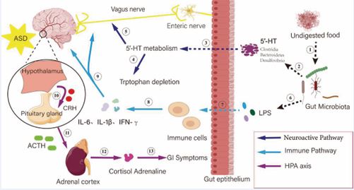 When the gut microflora is altered, the metabolites produced by the microorganisms are also altered, and the concomitant triggering of immune system abnormalities and HPA axis abnormalities will have an impact on the development of ASD.