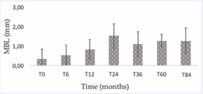 Additionally, marginal bone loss (MBL) remained below 1.5 mm throughout the observation period. Table 1 summarizes the average MBL values and standard deviations across different timepoints.