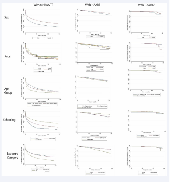It should be pointed out that, in general, survival time is smaller among patients without HAART. Taking into consideration the sex variable, men have smaller survival time than women, as well as those classified as being black or brown or belonging to older age groups. Lower level of schooling is also an important factor in decreasing the probability of survival. In relation to the type of exposure, injectable drug users show the lowest probability of survival.