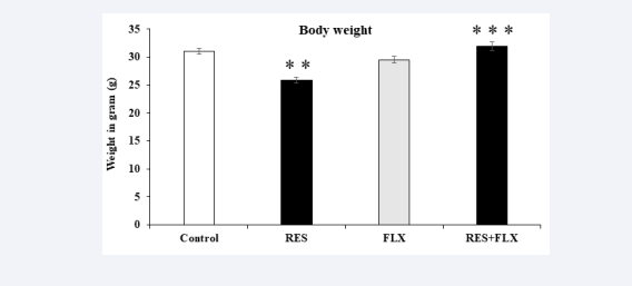 Figure 1: Effects of oral administration of RES, FLX and RES+FLX on the body weights. Values represent the mean± SEM of six animals. ** indicate significant difference from control group at p < 0.05. *** indicate significant difference from RES-exposed group at p < 0.05.