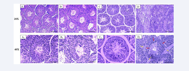 Figure 3: (A to D; 20X, A1 to D1; 40X). T.S. of the testis of control (A, A1), RES-exposed (B, B1) and FLX-treated (C, C1) mice, showing normal histopathology. T.S. of the testis of RES+FLX-treated (D D1) mouse, showing disorganized and shrunken seminiferous tubules, thickening of the tunica propria, vacuolization of the germ cells (red arrows) and diffused Leydig cells (yellow arrows).