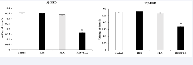 Figure 5: Effects of oral administration of RES, FLX and RES+FLX on the activities of 3β-HSD and 17β-HSD in the testes. Values represent the mean± SEM of six animals. * indicates significant difference from control and RES-exposed groups at p < 0.05.