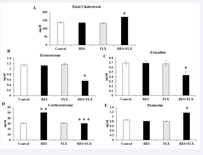 Figure 6: Effects of oral administration of RES, FLX and RES+FLX on the levels of serum cholesterol (A), testosterone (B), estradiol (C), plasma corticosterone (D), and prolactin (E). Values represent the mean± SEM of six animals. * indicates significant difference from control and RESexposed groups at p < 0.05. ** indicate significant difference from control group at p < 0.05. *** indicate significant difference from RES-exposed group at p < 0.05.
