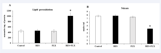Figure 8: Effects of oral administration of RES, FLX and RES+FLX on the levels of LPO (A) and nitrate (B) in the testes. Values represent the mean± SEM of six animals. * indicates significant difference from control and RES-exposed groups at p < 0.05.
