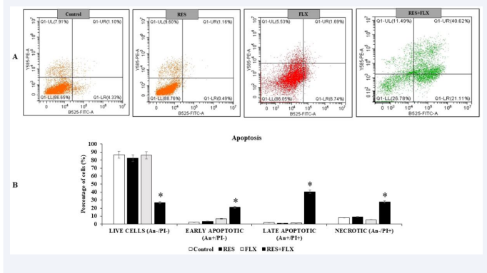 Effects of oral administration of RES, FLX and RES+FLX on the activity of germ cells apoptosis in the testis (A). Graphical representations  (B) of six animals. Values represent the mean± SEM of six animals. * indicates significant difference from control and RES-exposed groups at  p < 0.05.