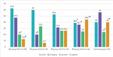 L. jensenii and L. gasseri were detected less commonly (28.3 and 30.2% respectively) (p<0.05). In samples with low LI (<30%), detection rates of L. iners significantly exceed those of other species (p<0.05) (Figure 3). A high LI was detected in 80% of samples from the control group and 60% in the pre-treatment BV group (Figure 4). Both groups also had samples with a LI of 70% (p<0.05).