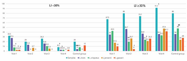 Table 5: Detection rates of Lactobacillus species in samples with LI below and above 30%.