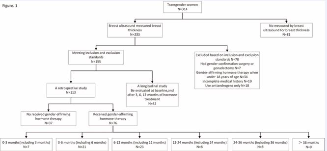 The study population comprised 314 transgender women who attended the outpatient clinic of the reproductive endocrinology department at a tertiary care hospital between July 2022 and July 2024 (Figure 1). Among them, 233 individuals underwent breast ultrasound examinations. A total of 155 patients met the inclusion-exclusion criteria, with 42 of these patients being evaluated at 0, 3, 6, and 12 months post-initiation of GAHT. In the retrospective analysis, 113 transgender women were selected based on a review of available case data, collecting baseline demographics, treatment duration, BFP, serum estradiol levels, and mammary gland thickness measurements. In the prospective longitudinal study, 42 patients receiving GAHT were followed up at 0, 3, 6, and 12 months post-treatment to gather data on demographics, BFP, serum estradiol levels, and mammary gland thickness.