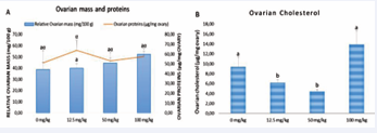 There was no significant effect on mass and proteins, but a significant decrease was noted in ovarian cholesterol levels at 12.5 mg/kg (p < 0.05) and 50 mg/kg (p < 0.001) dosages.
