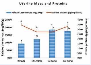 Rats’ uterine proteins were not significantly affected by AEAb, while masses were significantly increased in all treated animals compared to the controls, with the highest value observed in the 50 mg/kg treated animals (Figure 3).