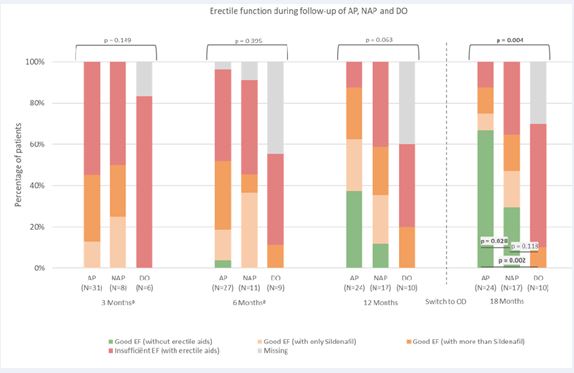 Methods: Between May 2021 and October 2022, patients with satisfactory preoperative EF and unsatisfactory EF after nsRP, without contraindications for sildenafil, In this single-centre study. The protocol included early initiation (≤4 mo) of daily sildenafil (75/100mg) and regular VED use (5 times a week), with 18 mo follow-up. EF was assessed using clinical reports and patient-reported outcomes (Erection Hardness Score and International Index of Erectile Function).