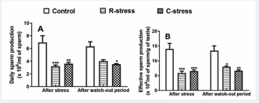 Figure 1 : Variation in daily (A) and effective (B) sperm production in rats after 4 weeks of stress and after a watch-out period. Each bar represents the mean ± SEM; n=6; *: p<0.05, **: p<0.01, ***: p<0.001, significant difference compared to the control; control: neutral control group. R-stress: restraint stress group. C-stress: cold stress group; One way and two way (repeated measures) ANOVA followed by Bonferroni post-test.