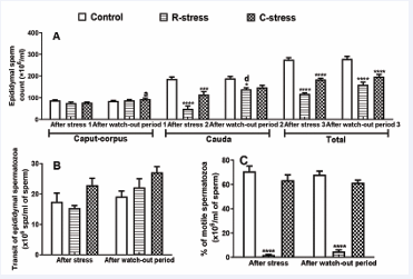 Effects on Epididymal Sperm Mobility, Sperm Count and Transit: Results obtained after 4 weeks of stress show that, compared to the control, 95.63% (p?0.001;R-stress) and 10.49% (p?0.05; C-stress) of decreases in the percentage of sperm mobility were registered in the two stressed groups. Moreover, after a watch-out period 93.15% and 17.93% of decreases in this parameter were recorded in stressed rats compared to the control (Figure 2A). According to the Figure 2B, 11.60% of decrease coupled to 23.94% of increase in the epididymal sperm transit were noticed in R-stress and C-stress respectively compared to the control.