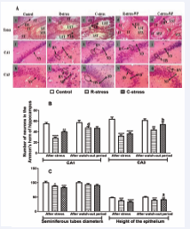 Figure 3 : Microphotographs (X100, 5 µm thickness, H&E Coloring) (A) of the testes (a-e) and Ammon’s horn 1 (CA1) (f-j) and 3 (CA3) (k-o) and variation in the diameter of the seminiferous tubules and the height of the epithelium (C), and in the number of cells in CA1 and CA3 (A) of the hippocampus in rats after 4 weeks of stress and after a watch-out period.